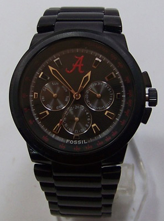 This Alabama Crimson Tide mens watch features a rarely seen Black ion plated stainless steel case and band. Round case has a black dial with three silver mini dials for day, date and 24 hour function. Multifunctional Sport watch with Alabama A logo at 12 O'clock and red tachometer indexes. Packaged in a collectible Fossil collectible tin. Water resistant to 5 ATM ( 50 meters, 165 feet), Case Diameter 40mm, band width: 22mm. Locking clasp, Removable links. There are some visible scratches on the case back where the band has made contact due to the protective plastic film being missing on the watch.