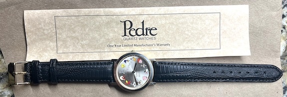 This 18K gold electroplated watch by Pedre commemorates 12 of the most well known immortal Warner Bros. Looney Tunes and Merrie Melodies cartoon characters. These characters were conceived by by The Warner Bros. creative department for over 50 years since the 1930s. This watch was released in 1991 by Pedre in a limited edition of 2000 as a first in a series of Looney Tunes watches.