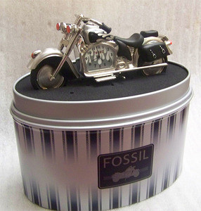 Fossil motorcycle desck clock, roadster with bags and flames. Sold Out Classic LImited Edition Collectible in new working condition. Includes Fossil collectible tin for low or high display: The tin that accompanies each desk clock can be used to display the clock down low on the padded lid or up high atop the raised tin at height of about 4-5 inches. The wheels turn, handlebars turn and kickstand can be up or down. Cycle size: 4 1/2 inches length by 2 inches height.