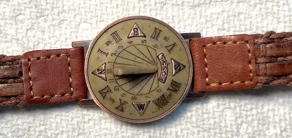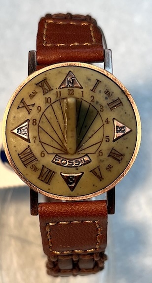 These sun dial wristwatches were released in the 70s and 80s. Primarily a novelty watch, they do function as a working sundial. There are no batteries as this is not a running watch. This is a sold out vintage Fossil collectible with stone face on copper case. There is a stainless steel center on the copper back case. Also has the original rare Fossil brown woven leather band.