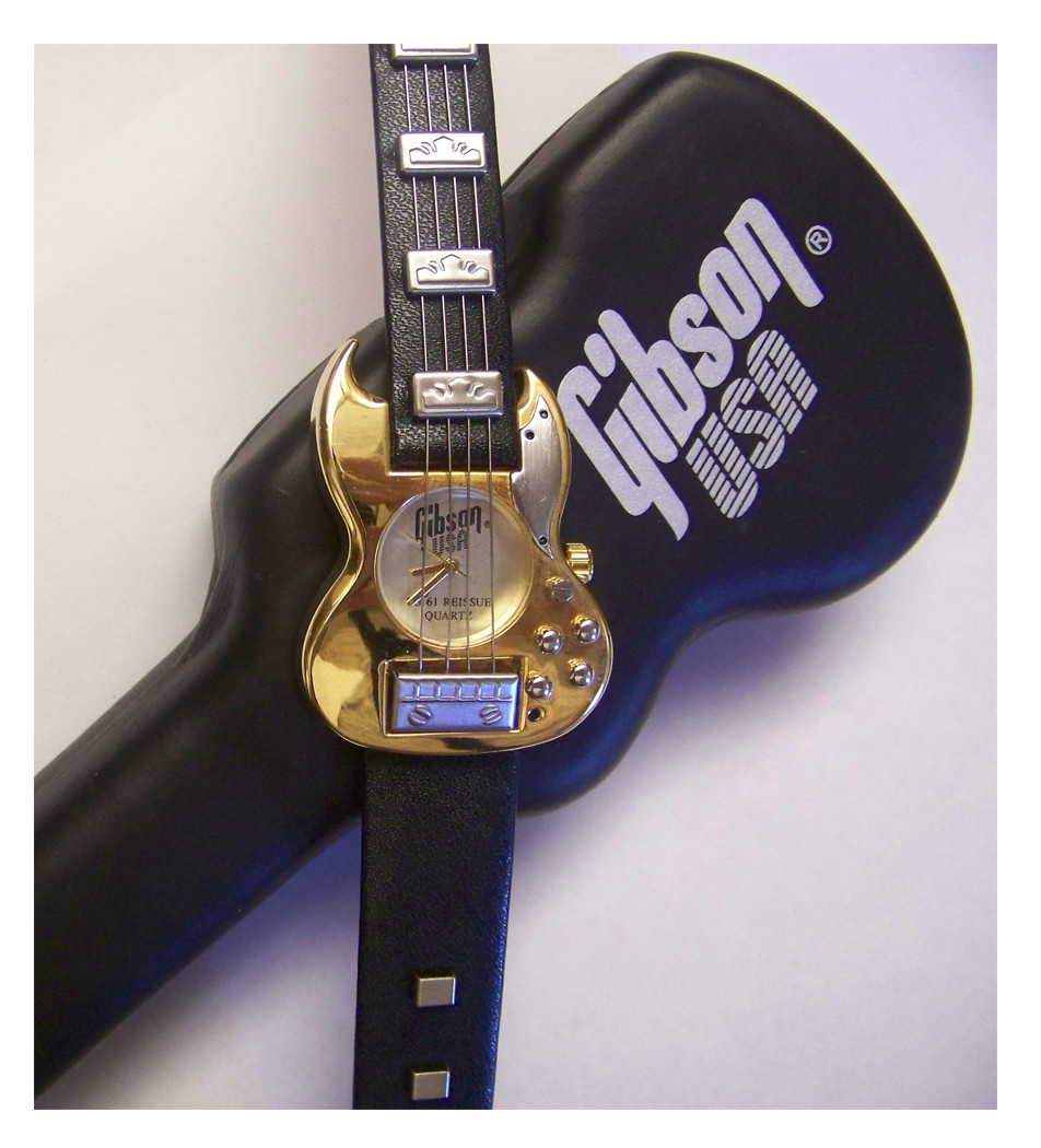 Manufactured by Gibson Corporation in 1996 as a promotional series. Modeled in great detail after the popular Gibson Les Paul SG 61 Re issued guitar. This mens watch features precision three hand Japanese quartz watch mechanism. Comes in a licensed hard shell black Gibson guitar case. Gold guitar shaped watch with silver accents. Stainless steel case back with Gibson USA written on back and Gibson Guitar Corp 1996. The band is designed like the neck of a guitar with Gibson headstock fits up to 9 1/2 inch diameter wrists. This is a rare sold out collectible novelty mens wristwatch. Black leather band width 14mm. Guitar shaped watch case with diameter of 36mm at widest point.