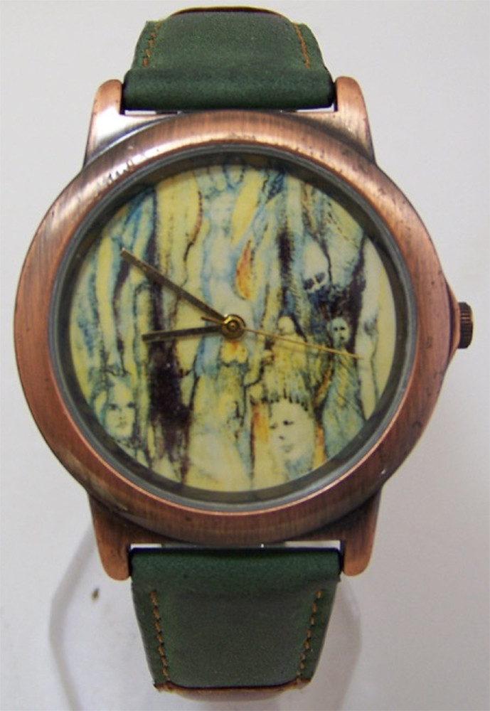 Three hand Japanese quartz movement, Case diameter: 36mm Band width 18mm. The artwork is framed by a copper bezel. Comes on a brown and Green watch band that shows some wear so we are also including an additional new band of similar design. Both the original and the new replacement will come with this purchase. This item will ship in a Fossil collectible watch tin.