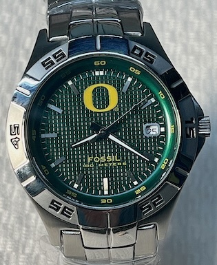 University of Oregon Ducks mens Fossil watch, Sports wristwatch with date Display. Team logo at 12 O'clock on a textured background with a comfortable contoured Stainless steel band. Date display window at 3 o'clock. Case size 40mm, band width 20mm. Mineral crystal, three hand analog display with quartz movement. Luminous dials, locking clasp, Water resistant up to 10 ATM (100 Meters, 335 Feet.). New, working condition with new battery and ships in a Fossil collectible tin.