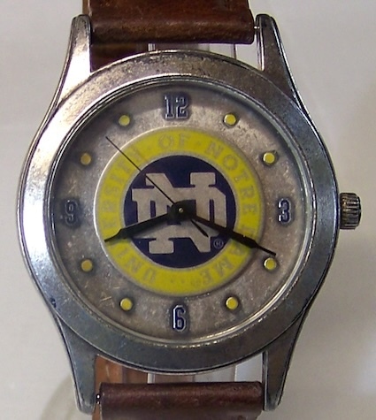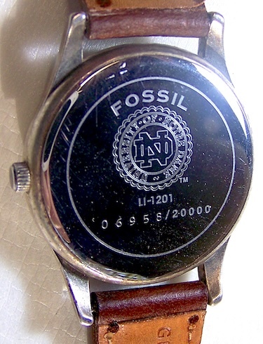 Fossil Notre Dame men's vintage numbered limited edition collectible watchThe watch has a centered team logo on brushed antiqued silver background Set in a stainless steel case with a comfortable black Fossil leather band. Crystal is scratch free. Case Size: 36mm, Band width: 18mm, Fixed bezel, mineral crystal, round shape, three hand luminous hands analog display, quartz movement, The 36mm case size makes this ideal as either a mens watch or an over sized new trend ladies watch.